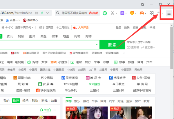 第一步,打开360浏览器,点击主页右上方的【三】形状按钮,并点击【设置】选项。