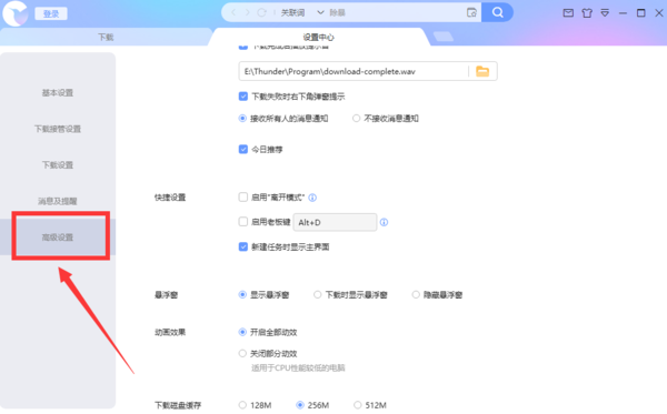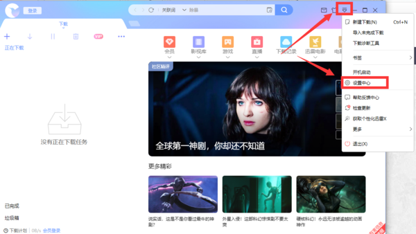 第一步,在电脑上打开迅雷客户端,在主页的右上角点击展开【主菜单】并选择【设置中心】。