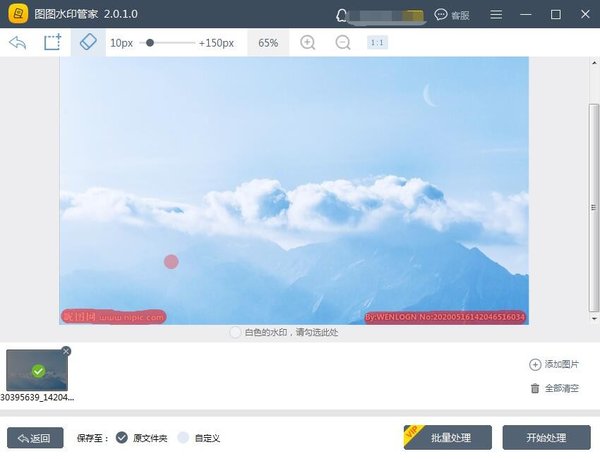 步骤三、通过点击软件上方工具栏上的【+】、【-】来调整图片大小,把需要去除的水印调整到视野中来,并选择软件上方工具栏上的橡皮擦工具来擦涂水印,橡皮擦工具可以滑动工具栏上的横条来调整大小。把需要去除的水印完整涂擦覆盖后,点击【开始处理】按钮正式进入图片去水印过程。