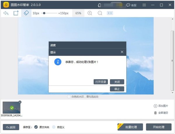 步骤四、很快软件会跳出一个提示查看,提示成功去除水印,这时候我们可以点击提示窗口上的打开目录按钮进入去水印后图片的保存文件夹里面找到去水印后的图片进行查看和编辑操作。