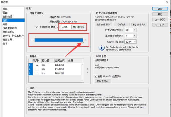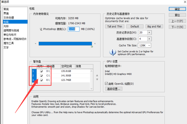第三步,在下方的【暂存盘】模块,将所有的磁盘都勾选,当然也可以勾选一个剩余存储比较大的磁盘。