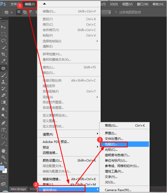 第一步,在电脑上打开PS软件,然后点击左上角的【编辑】按钮,在展开的菜单中点击选择最后一项【首选项】,再点击【性能】。