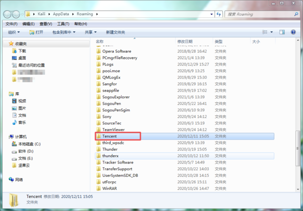 ②接着我们在软件弹出的文件夹当中,将【Roaming】文件夹下的【Tencent】文件夹进行删除。