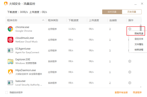 在流量监控中,我们可以看到所有使用网络的软件,找到需要限速的软件,点击右侧的设置,选择限制网速。
