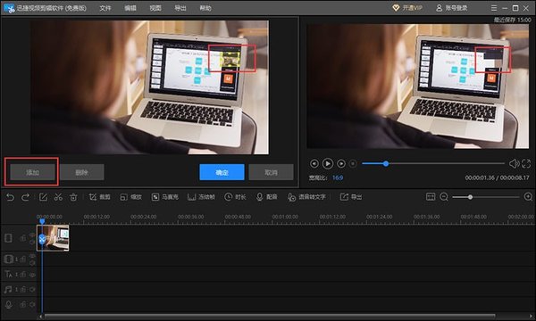 给视频中固定位置比移动位置打码来说要容易一些,首先还是得先把迅捷视频剪辑软件打开,并且把需要打码处理的视频文件添加进来,然后在视频编辑软件页面的中间位置,有一个【马赛克】选项,点击之后在侧面点击【添加】按钮,接下来直接在视频画面中画一个框就可以,画框的位置就被打马赛克了。