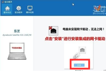 第二步,检测完毕之后,会出现提示【电脑未安装网卡驱动,无法上网】,并且会提供一个网卡驱动的安装按钮,点击这个【安装】按钮即可。
