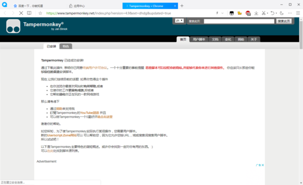 扩展程序安装成功后,浏览器会自动打开油猴插件的主页,之后可以按照自己的需求安装各类脚本。