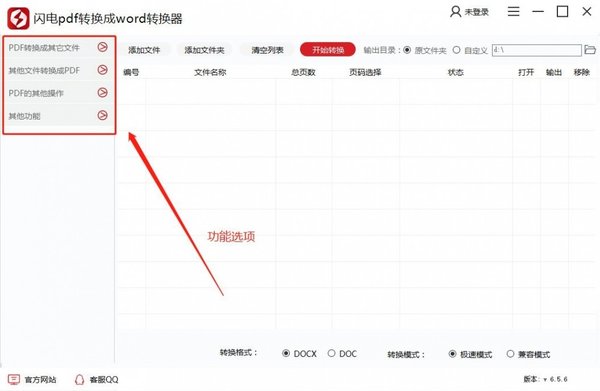 1、首先下载闪电PDF转换成WORD转换器,然后双击打开,操作主界面上有详细的转换功能选项,用户根据自己的需要选择相应的转换功能即可。
