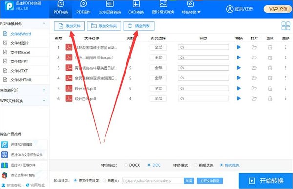 第二步,点击【添加文件】或者【添加文件夹】选项,把需要进行格式转换的PDF文件全部加到转换器中,进行批量转换。
