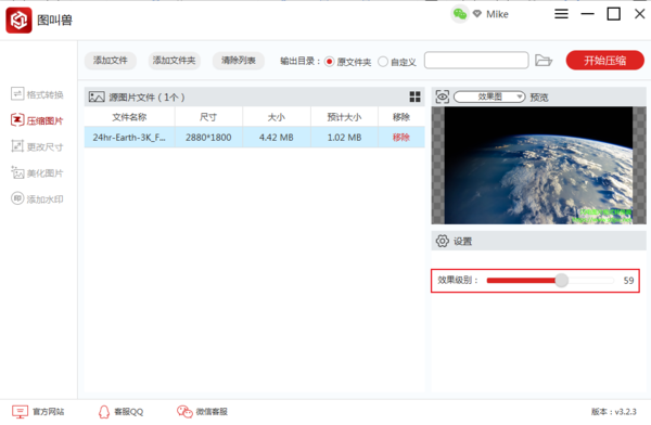 拖动右侧的效果级别可以对图片的压缩程度进行调整,压缩效果可以通过上方的预览查看。
