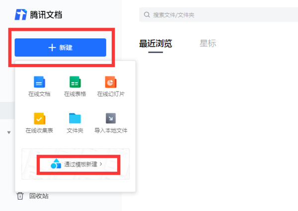 第一步,打开腾讯文档,点击页面左侧的【新建】按钮,然后选择【通过模板新建】按钮。