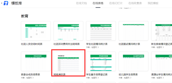 第二步,这时候就进入了文档模板页面,在【教育】模块下选择【班级通讯录】模板。