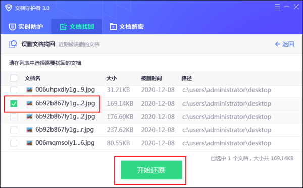 找到需要恢复的文件,将文件前方的复选框选中,点击开始还原即可。