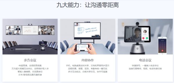 3、视频直播。智能会议设备、手机、电脑随时随地发起直播;专业CDN直播网络加速,百万级并发直播能力;多机位实时直播,全方位展示直播现场画面;视频连线、聊天室沟通、观众投票、高效沟通。