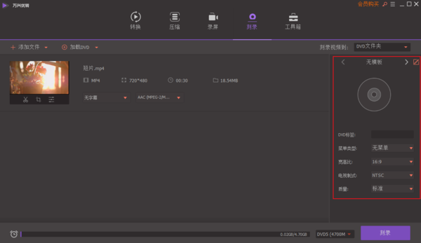 完成视频的添加后,可以在软件右侧选择需要使用的模板以及视频的宽高比、电视制式以及质量。
