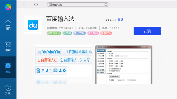 小编这里使用的是腾讯电脑管家的软件管理功能,在软件管理界面,直接输入“百度输入法”进行搜索,出现结果后,点击对应选项右侧的“安装”键就可以了。