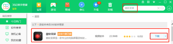这里小编使用的是360软件管家,在电脑打开软件管家之后,直接搜索傲软录屏。出现并找到想要的结果后,点击对应选项右侧的“下载”键就行了。
