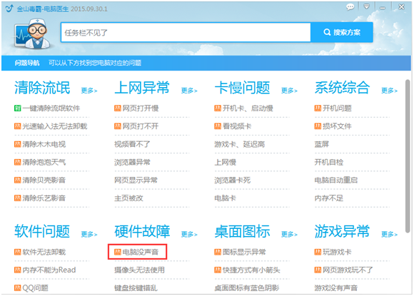 第二步,进入电脑医生页面之后,在【硬件故障】选项卡里,有一个【电脑没声音】的选项,点击即可。