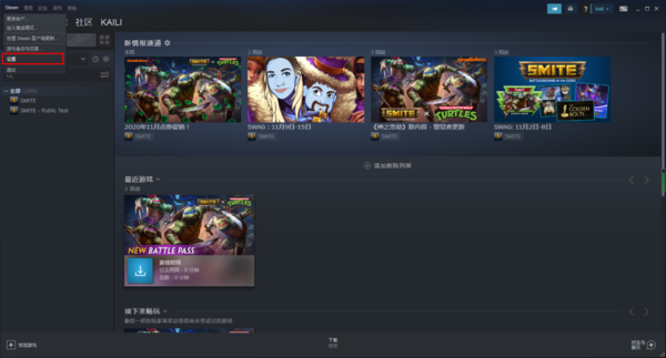 第一步,打开电脑上的steam软件,登录进入到软件的主界面当中后,我们找到界面顶部左上角的【steam】选项,并点击打开,然后在弹出的选项当中,选择【设置】选项。