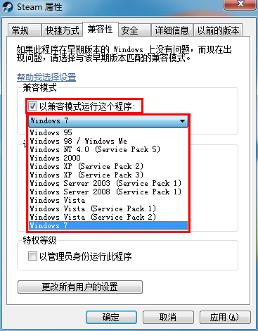 进入到Steam兼容性属性界面后,我们在界面当中,找到【兼容模式】选项,然后勾选【以兼容模式运行这个程序】选项,接着在其下方的下拉选项当中,选择自己电脑的操作系统。