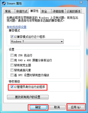 然后在找到界面当中的【特权等级】一栏,并勾选其下方的【以管理员身份运行此程序】选项,接着再点击【应用】按钮,最后在点击【确定】按钮即可。