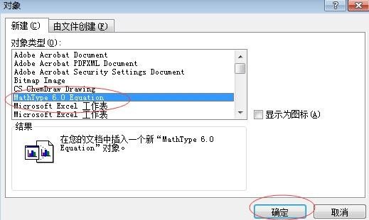 第三步,点击Word文档工具栏上的【插入】,并展开【对象】的下拉菜单,点击选择【对象】,在弹出的【对象】对话框中,【新建对象类型】处选择【MathType6.0?Equtaion】选项,并点击【确定】,MathType主程序就打开了。