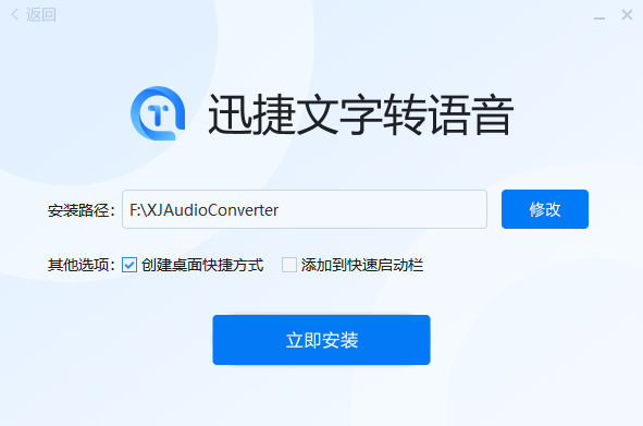 我们需要先选择软件的安装路径,然后根据实际情况可选择是否创建快捷方式以及是否开机启动,在都设置完成后,就可以点击“立即安装”了。顺便提一下,在选择安装路径时,尽量避免将迅捷文字转语音软件放到系统盘,不然会影响电脑整体的运行速度。