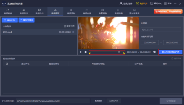 拖动视频下方的进度条,选择需要提取的背景音乐区间,完成选择后点击右侧的确认并添加到输出列表。