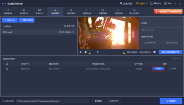 添加到输出列表后,我们就可以看到要提取的音频了,点击右侧的提取,等待软件处理即可。