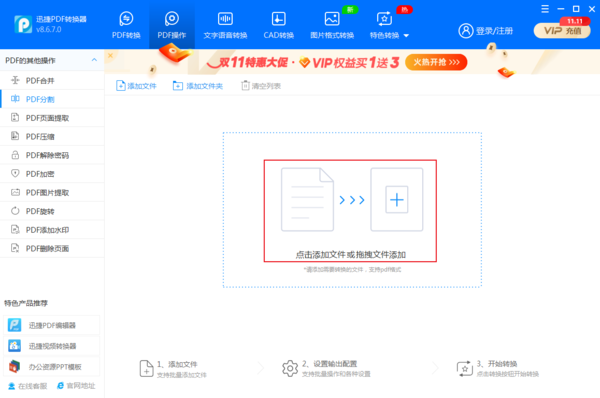 点击软件中间的加号,将需要拆分的PDF添加到软件中。