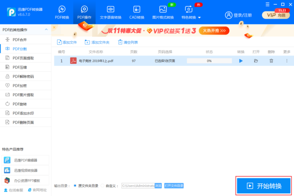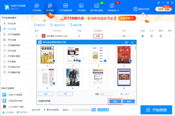 完成PDF页面的选择后,点击右下方的开始转换,等待软件进行拆分即可。