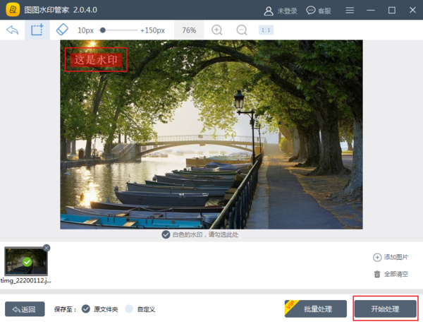 用矩形框橡皮擦工具框选图片中的水印,之后点击右下方的开始处理即可。