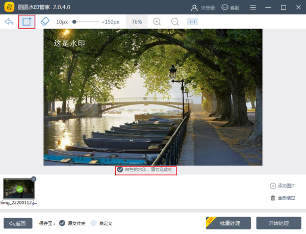 由于是白色水印,因此首先勾选图片下方的功能选项,接着点击上方工具栏中的矩形框橡皮擦工具。