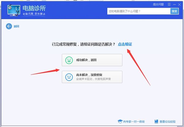 第六步,修复完成之后,在提示框中点击【点击验证】,验证一下电脑声音异常问题是否解决。