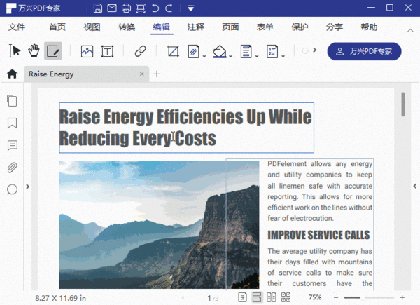 第二步、在万兴PDF专家界面上方的工具条中,点击“编辑”;再在下方的功能选项中点击“水印