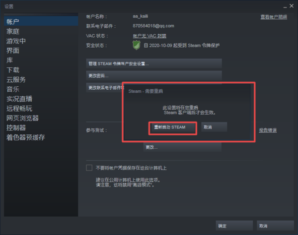 第六步,接着软件就会弹出【Steam需要重启】的提示窗口了,我们点击【重新启动Steam】按钮,将Steam平台进行重启。