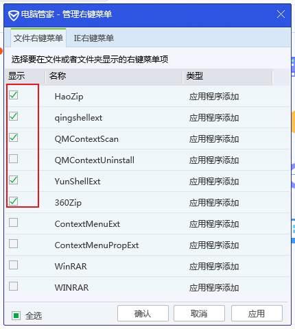 在右键菜单管理中,所有在鼠标右键菜单中显示的软件都处于选中状态,将显示下方的勾选取消后,就可以隐藏该软件的右键菜单。