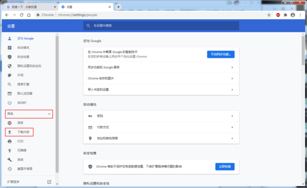 在设置页面中点击左侧的高级,选择下载内容。