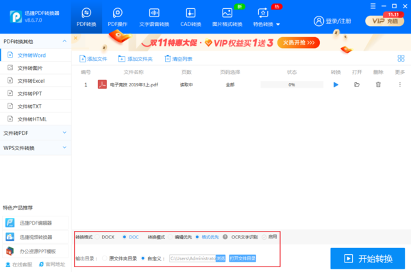 添加好需要转换的PDF文档后,在下方的设置中选择需要转换的格式和文档的输出目录。