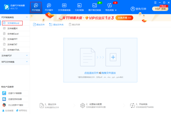 首先打开迅捷PDF转换器,点击上方的PDF转换,选择左侧的文件转Word。