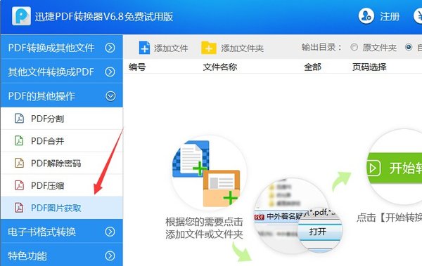 第一步,打开迅捷PDF转换器软件,进入主页之后,在左侧的功能选择区点击展开【PDF的其他操作】按钮,就可以看到最下方的一个选项就是【PDF图片获取】功能选项,点击即可进入功能页面。