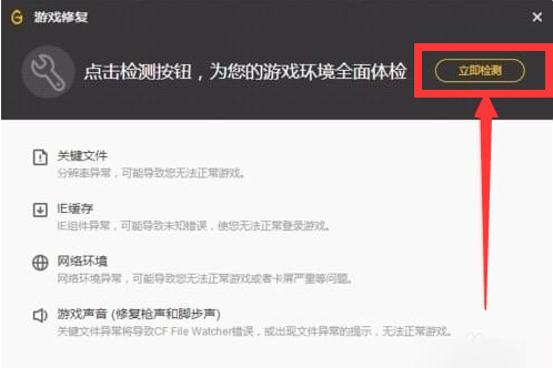 第三步,接下来就会弹出【游戏修复】对话框,我们点击右上方的黄色【立即检测】按钮。
