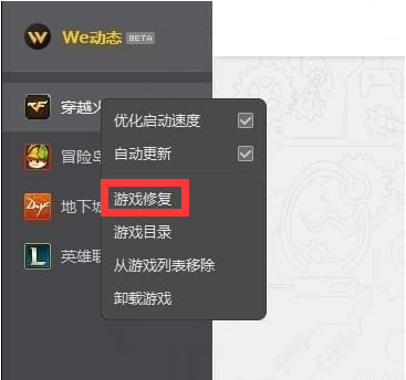第二步,右击【穿越火线】这个名称,在展开的下拉菜单中,点击【游戏修复】选项。