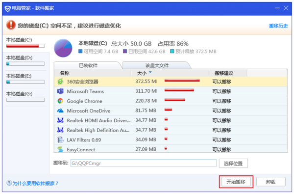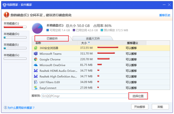 以上就是使用腾讯电脑管家进行软件搬家的方法,合理使用这项功能,可以让电脑的存储空间更加合理,同时也能保证电脑运行流畅。