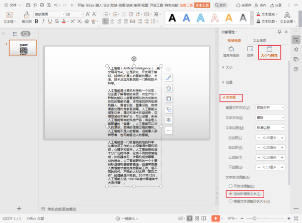 在右侧窗口中选择大小与属性—文本框,将文字自动调整下的溢出时缩排文字选中。