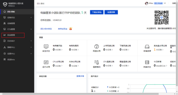 首先打开电脑管家小团队版,将光标移动到左上的logo处,点击管理后台。