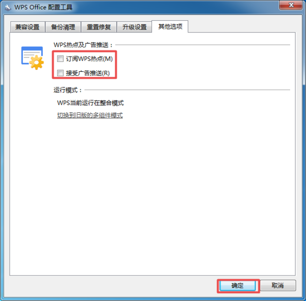 第六步,此时我们将【订阅WPS热点】以及【接收广告推送】全部取消勾选,软件点击窗口下方的【确定】按钮,就可以对设置进行保存了。