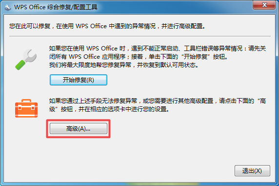 第三步,此时软件就会弹出【WPS?Office综合修复/配置工具】窗口了,在此窗口当中,我们选择【高级】按钮,并点击打开。