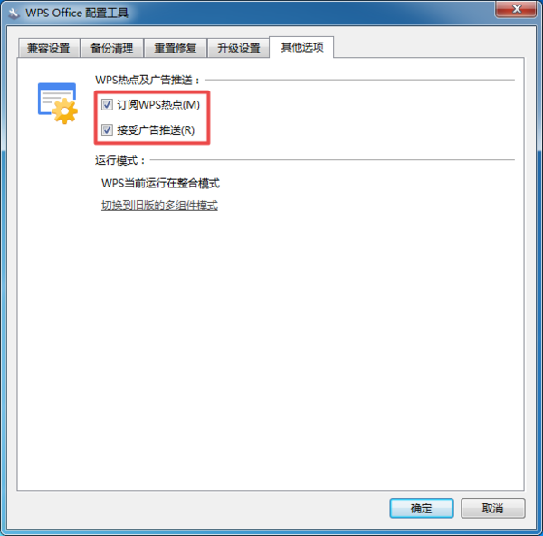 第五步,进入到其他选项设置界面当中,我们在窗口顶部可以看到【订阅WPS热点】以及【接收广告推送】两个功能都是已经勾选了的。