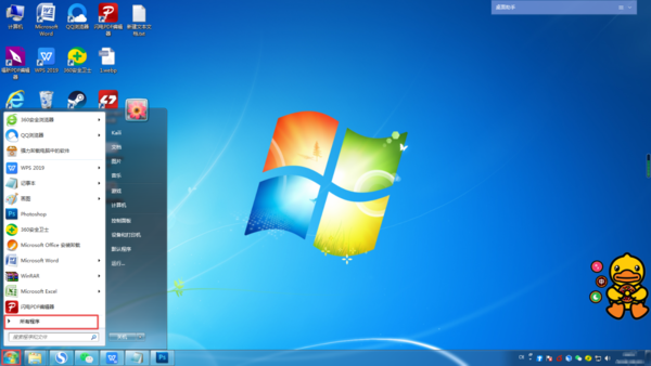 第一步,在电脑桌面的左下角,找到【开始菜单】按钮,然后点击打开,接着选择【所有程序】选项。